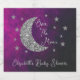 Sobre o chá de fraldas da lua com lua de prata e estrelas contra um fundo negro e rosa do céu noturno roxo