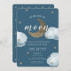 Este belo convite para o chá de fraldas "Sobre a Lua" apresenta fundo azul-da-meia-noite / marinho azul com uma lua de crescente brilho dourada, estrelas e nuvens lisas no céu noturno. Altere a cor de fundo e personalize para suas necessidades. Você pode encontrar mais produtos correspondentes na minha loja.