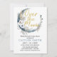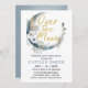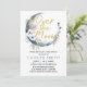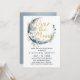 Este convite apresenta uma lua com elementos de boho com a frase "Sobre a Lua". Cor azul empoeirada e inscrição dourada.