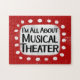 "Sou All About Musical Theater" é um design de texto fofo em vermelho com texto preto, junto com uma forma de sotaque branca e pontos brancos texturizados ao seu redor.
