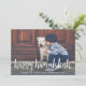 Compartilhe cartões de natal com esses cartões com fotos Hanukkah apresentando sua foto favorita horizontal ou orientada a paisagem em uma sangria de cheio impressionante. "Happy Hanukkah" aparece no fundo como uma camada de texto em tipografia escrita com pincel branco. Personalize com seu nome ou nomes de família abaixo e uma saudação personalizada, se desejar. Cartões que se revertem para um ponto de aquarela e que deixa o padrão em azul e branco marinho.