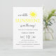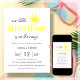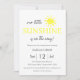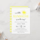Simples e moderno convite para o chá de fraldas de Verão, com um sol fofo sobre um fundo branco limpo. Com as palavras " o nosso pequeno sol está a caminho " e estripa amarelo pastel e branco para trás. Pronto para uma personalização fácil.