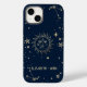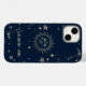 Sol e lua dourados celestiais, e estrelas em fundo azul-marinho.