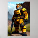 Um retrato de um legal soldado de tigre na armadura amarela e segurando uma arma com a natureza no fundo. Esta é uma arte gerada por IA.