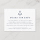 Deslize estas cartas para os convites para o chá de bebê quando solicitar livros em vez de cartas. Design náutica apresenta a inscrição azul marinho com uma ilustração da âncora do marinho pequena no topo. Um poema doce explica o pedido do livro: "Apenas um pedido, esperamos que não seja duro // Por favor traga um livro em vez de um cartão // Assinando seu nome, nós nos lembraremos e compartilharemos // seu doce presente, mesmo quando você não estiver lá." Personalize com o nome do convidado de honra e a data do chá no final.
