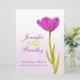 Tulipa roxa de solteiro linda numa cinza de efeito rústico roxo em papel de convite para o casamento floral. Edite este convite com suas próprias palavras e detalhes do casamento. Simples convite para belas artes ao estilo romântico do país. Design e pintura aquosa por Sarah Trett para www.mylittleedenweddings.com