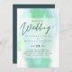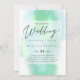 Convite de casamento moderno com campos de modelo de texto em ambos os lados e uma nuvem de cor azul esverdeada.