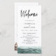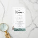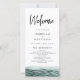 Esta ordem de serviço do programa de casamento apresenta águas oceânicas a aquarelas e palmeiras com uma letra escura manuscrita. Use este programa para detalhar a linha do dia do casamento, o bios da festa noiva e uma nota especial de obrigados. Este programa é perfeito para uma celebração de casamento de destino de praia de uma ilha tropical.