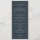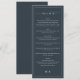 This elegant wedding menu features a sophisticated, vertically oriented layout with a deep navy blue background. The design uses a mix of cursive and serif fonts to create a luxurious feel, with clear section headings for starters, salad, main course, and dessert. The minimalist color palette of white text on navy enhances readability and adds a modern touch. Centered alignment and generous spacing contribute to the balanced composition, making it perfect for a high-end dining experience.