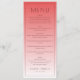 This elegant wedding menu features a minimalist design with a soft salmon pink background and crisp black serif typography, creating a warm yet sophisticated aesthetic. The layout is clean and organized, with sections for Starters, Salad, Main Course, and Dessert neatly arranged to guide guests through the meal options. Each section uses consistent font styles and ample spacing for readability, enhancing the modern and refined look of the menu. Perfect for an upscale dining experience, this design conveys a mood of understated luxury and simplicity, ideal for celebrating special moments like weddings.