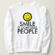 A camisa do slogan de texto lê com um gráfico de rosto feliz sorridente lê sorriso que confunde pessoas. O texto preto com três palavras usa ou personaliza com suas próprias palavras sorridentes. Palavras ideais para levantar seus espíritos quando você está se sentindo mal e, embora possa não fazer nossos problemas desaparecerem, pelo menos impedirá que as pessoas perguntem o que está errado ou apenas os confunda ;) Projetado por www.mylittleeden.com