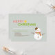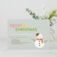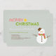 Este belo convite tem um sorridente boneco de neve contra um belo fundo azul com neve e o texto - Feliz Natal, escrito em vermelho e verde.
