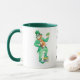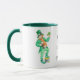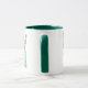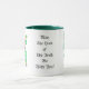 Uma caneca branca com uma pega verde escura e jante. Um motivo de "duende", para trás e para a frente, é separado pela inscrição: "Que a sorte dos irlandeses esteja consigo!"