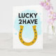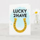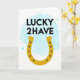 Este cartão apresenta uma ferradura dourada centrada em um fundo branco, seu tom amarelo quente dando à cena um brilho amigável e acolhedor 💚. Acima dela, as palavras “LUCKY 2HAVE” estão empilhadas em letras maiúsculas pretas, sentadas perfeitamente sobre a ferradura como um título confiante. Uma lavagem suave de azul-cerúleo flutua atrás do texto superior e da curva superior da ferradura, como uma nuvem leve pairando sobre um céu calmo. Pequenos pontos azul-escuros correm ao longo da ferradura como marcas de rebites arrumadas, adicionando um detalhe fundamentado que equilibra o dourado solar. Círculos azuis translúcidos mais tênues se espalham em torno da lavagem azul, como bolhas subindo e flutuando, o que faz com que o espaço se sinta arejado e íntimo. O layout simples deixa muito espaço branco, fazendo com que a ferradura e a mensagem pareçam ser destinadas a alguém que
