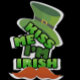 Uma ilustração digital sobre um fundo preto mostra uma Rua. O tema do Dia de Patrick. No topo, um chapéu verde de duende com banda preta e fivela de fecho dourada é inclinado ligeiramente para a direita. Abaixo do chapéu, as palavras "BEIJEM EU SOU IRLANDÊS" são empilhadas em letras brancas com preenchimento verde. Por baixo do texto, aparece um bigode castanho com extremidades enroladas. A ilustração tem um estilo limpo e cartoonista com contornos ousados e cores planas, dando-lhe uma aparência lúdica e festiva.
