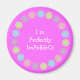 Íman cor-de-rosa redondo com flores de desenho animado bonito e as palavras "Sou perfeitamente ImPeRfeCt". A cor e o texto em segundo plano são personalizáveis - cargas de fontes e cores a serem escolhidas. Visite minha loja Sober Princess para ofertas únicas e divertidas para pessoas em recuperação de álcool e vícios (e seus cachorros!) - e presentes com mensagens espirituais/inspiracionais. Todas as ilustrações criadas por um alcoólico em recuperação.