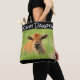 Saco de tote com um belo vitelo de búfalo de um lado e filhotes de cachorros de pradarias bonitos do outro lado. Fotos tiradas por Karla Chrast.