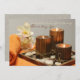 Um design de na moda com uma toalha enrolada e uma bandeja com três velas acesas e rochas de rios. Um ramo de cimbidiões cremosos adorna a bandeja. (PB)