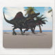 Dois dinossauros do Spinossauro caminham numa praia em tempos pré-históricos na era Cretácea.