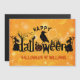 Bonita e criativa design do conceito de Halloween, onde as letras são feitas de símbolos de halloween. Árvores assustadoras, bruxas, corvos negros, morcegos voadores, etc. Textura laranja amarela com texto personalizável e opcional.