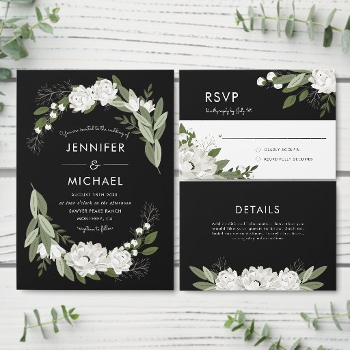 Branca em preto, cartão de RSVP floral. Personalizável. Parte de uma coleção de casamentos