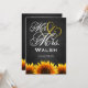 Convites do Sr. & da Sra. Preto Quadro Girassol Casamento---combine os cartões de RSVP e mais encontraram abaixo nesta página. Felicite seu tema do casamento do girassol com estes convites que caracterizam uma textura preta do quadro como um fundo com Sr. & Sra. no roteiro elegante com os girassóis vibrantes na parte inferior da parte dianteira e da parte traseira de cada convite.