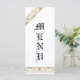 Este menu de casamento é decorado com as cores Starfish e Whitecap Cinzas em bares damask sobrepostas a um fundo branco.