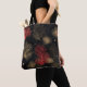 Um padrão sem descontinuidades impressionante de arbustos inspirados no deserto, em vermelho vibrante e ouro pálido e macio, espalhados por uma canvas preta cheia de minúsculas estrelas ouros.
