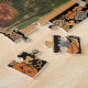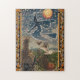 Quebra-cabeça de Halloween com uma bruxa estrelada voando através de um céu noturno estrelado sobre campos com abóboras, um gato preto, uma coruja, e uma lua que parece uma abóbora. Este é de um design de cartão de Halloween de 1913.