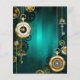 Joias, relógio de ouro com uma corrente de ouro e teclas num fundo textural verde. Estilo Steampunk.