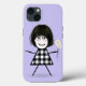 Garota bonitinha com cabelo, óculos, vestido de xadrez de búfalo, e segurando buquê de margarida em fundo roxo. A cor de fundo pode ser alterada.