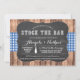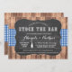 O giz estoque o convite para a festa do bar com a marca azul e madeira rústica. Perfeito para um noivado, um chá de casais ou uma equipe do bar, altere o texto para se adequar à sua festa.