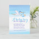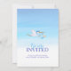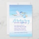 Convite para chás de fraldas bonitos, com pintura de aquarela fofa de uma cegonha-branca a entregar um novo bebê. Convites de chuveiro de bebê novo e caprichoso. Personalize com os detalhes do seu chá de fraldas. © Pintura única em aquarela e projetada por Sarah Trett.