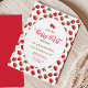 Diversão do convite de aniversário "berry first" com um toque de retrorreflector para comemorações de primeiro aniversario. Apresenta um padrão de morango fofo e uma fonte vermelha de script de contraste.