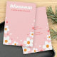 Placa de exibição de joias com flor branca de morango em fundo cor-de-rosa e nome de sua empresa ou design em letra retrô.