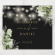 Luzes de cordas elegantes, verde, etiquetas de vinho espumante preto floral e dourado personalizadas com seus nomes e data especial de casamento. Projetado por Thisnotme©
