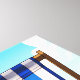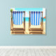 An illustration from a photograph of two blue and white striped deckchairs on a beach themed background printed on a canvas.