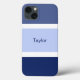 Vocês vão adorar esta capa de telefone náutica na moda com uma faixa azul e branca. Vários tons de grandes listras azuis mais pequenas listras brancas. Personalizado com seu nome impresso em um texto azul.