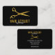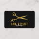 Uma tesoura de cabeleireiro de ouro moderna, com fundo preto, ideal para cabeleireiros ou negócios relacionados a salões de beleza. Uma maneira simples e profissional de apresentar sua empresa. Personalize seus detalhes para criar seu próprio cartão de visita exclusivo.