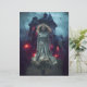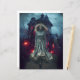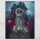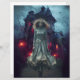 Uma jovem misteriosa de vestido fluente fica em frente a uma mansão gótica com janelas vermelhas brilhantes, colocadas contra um céu escuro e estranho. Árvores negras e morcegos voadores aumentam ainda mais a tensão atmosférica. Digital Art Photoshop CS5