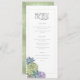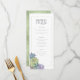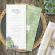 Fontes únicas, suculentos coloridos de aquarelas e fundos brilhantes em um primavera verde macio são os destaques desses produtos de casamento misturados e combinados. Este belo menu de recepção tem uma modelo para editar as seleções de menu junto com as iniciais da noiva e do noivo e a data do casamento. Um padrão brilhante e texturizado, em tons claros e escuros de verde primavera, adiciona um fundo contrastante no reverso. Procure ID515 para ver todos os produtos correspondentes neste conjunto.