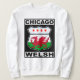 Chicago Welsh design, ao estilo de um legal sinal de estrada americano. O texto Chicago Welsh está ao longo do topo e do fundo, com a bandeira da cidade de Chicago e a bandeira do País de Gales dentro. Excelente para chicagoas de ascendência galesa e para ex-pats na cidade de Windy.