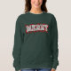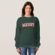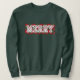 Entre no espírito de Natal com este suéter de Natal divertido. A inscrição "FELIZ" no estilo clássico da faculdade, sentada sobre um bloco de fundo de tartã vermelho, verde e branco.