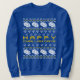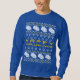 Os nacos de pão e menorahs e estrelas e dreidels compo esta "camisola feia de Hanukkah".