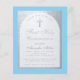 Um primeiro convite à comunhão do orçamento para um rapaz. Em um fundo retangular azul claro ("azul bebê"), ele tem um arco falso de folha de alumínio prateado que tem texto de cinza sobre fundo branco. A ocasião e o nome são escritos em um roteiro caligráfico elegante; a primeira linha é o texto arquivado.