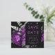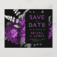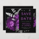 Este elegante e melancólico casamento Salve o cartão de Data apresenta um buquê floral romântico e luxuoso em roxo de ameixa com folha de prata e folhagem brilhante num fundo preto. Personalize a cinza prateada e o texto da ameixa em fontes na moda num retângulo preto e adicione o URL do seu site de casamento ao fundo preto sólido.