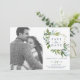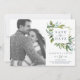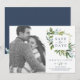 Esta foto verde de verão para salvar o cartão de data é perfeito para um elegante casamento no meio do verão. O design botânico apresenta um arranjo exuberante de cor d'água pintada, eucalipto, verde e folhas verdes com sutis manchas de flores rosadas e cor-de-rosa. Personalize o cartão com sua foto de noivado, nomes, data de casamento e endereço do site.