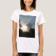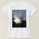 Uma fotografia de uma bela explosão de sol a espreitar por detrás de uma nuvem branca contra um céu azul sobre algumas árvores numa camisa