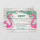 flamingos cor-de-rosa divertidos e palmeiras verdes tropicais destacam esta tendência de casamento RSVP em um fundo de madeira branqueada ao sol, fazer-a perfeita para um destino, praia, Havaí, Caribe ou casamento tropical. Itens de coordenação podem ser encontrados na Coleção Sun Kissed Flamingo Wedding.