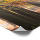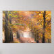 Poster impressão de raios de luz criados por raios solares através da folhagem das árvores ao longo de um caminho através de uma floresta no nevoeiro matinal do outono.